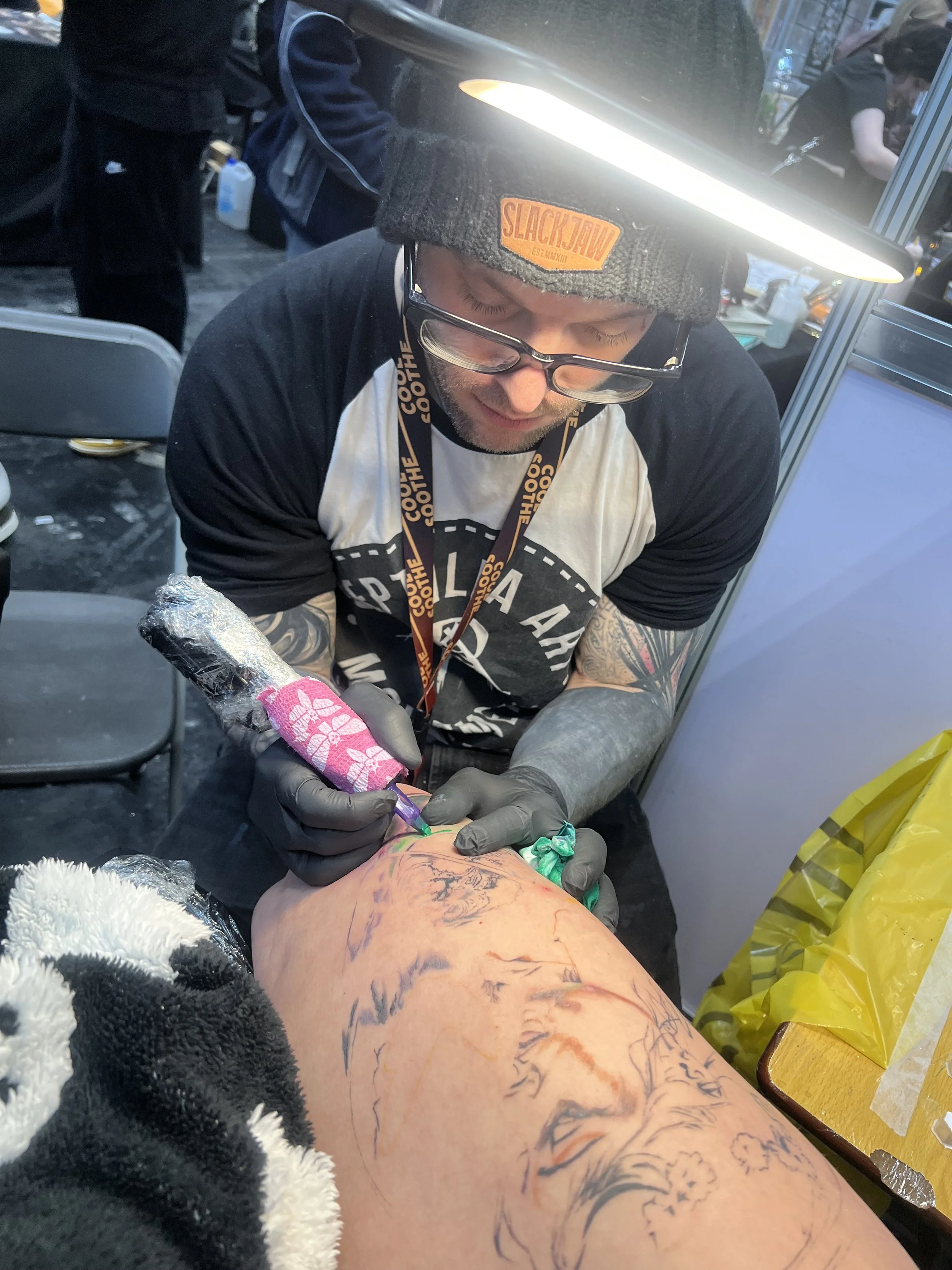 Over the weekend myself and the crew over at Burns Ink attended the Tattoo Tea Party convention in Manchester. Overall, an amazing show. It’s always a highlight of the British convention season, and it was awesome to meet some new friends and hang out with some old ones. I got very friendly with Noddy from Quantum Ink and got to play with some new inks! On the Saturday I worked on a baroque piece which is always a highlight for me and I also worked on my Girlfriend Hannah’s thigh piece. It was a BIG session, and she got real bad tattoo flu. On the whole, it was a fun weekend! Good food, cool tattoos, and all in probably my favourite city in the UK! As usual at a convention like that, there was almost too much to see and do, and I didn’t get much chance to walk around and see much, but the organisers did an amazing job!